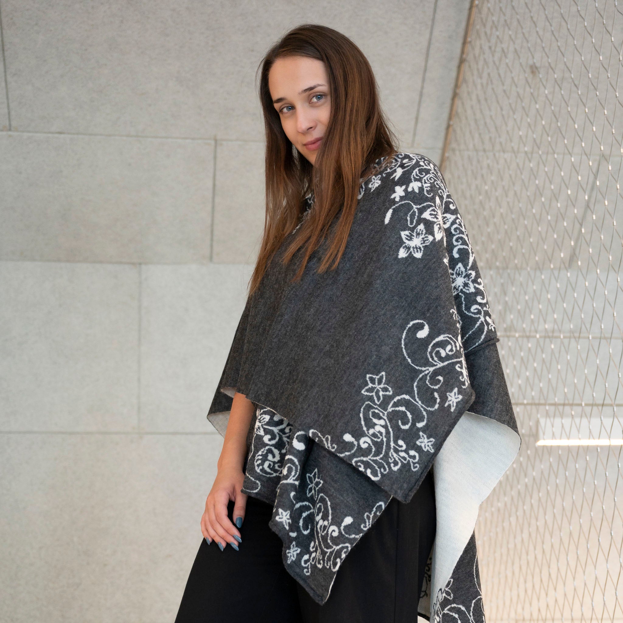 Poncho en alpaga pour femme aux couleurs naturelles de l'alpaga, avec un subtil motif floral. Une élégance qui peut être combinée de nombreuses façons et qui ne se démode jamais. Fabriqué à partir de 100 % de bébé alpaga, la laine d'alpaga la plus douce et la plus chaude.